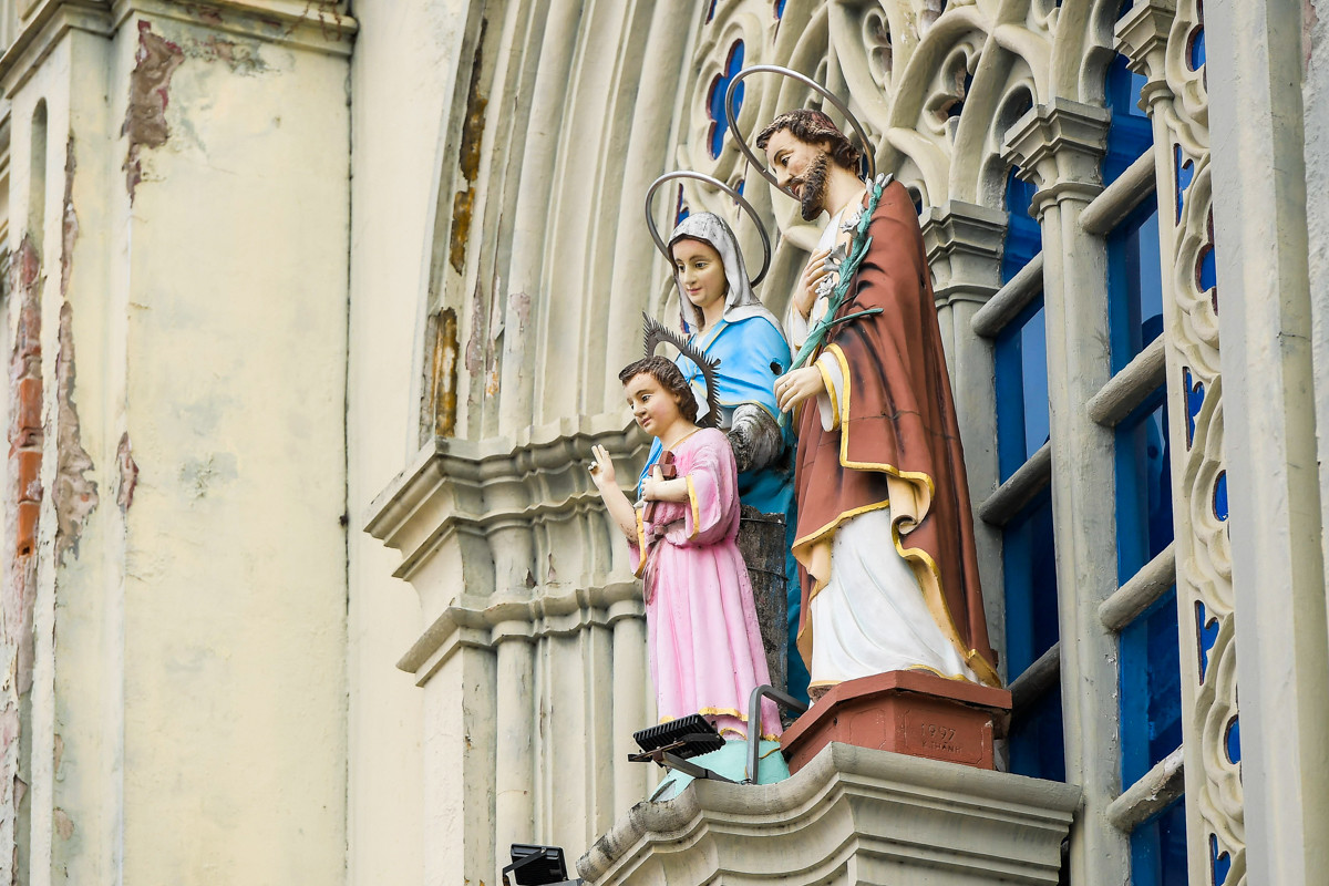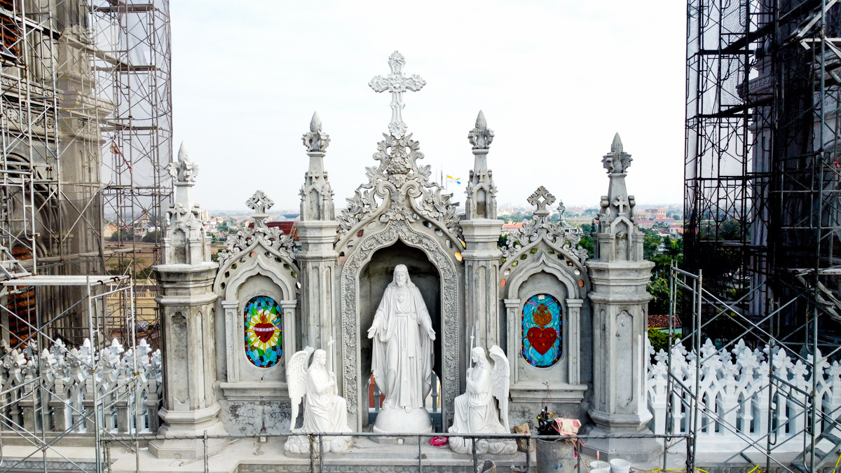 Xung quanh nhà thờ có các phù điêu thể hiện 14 Đàng Thánh Giá nằm như một tòa lâu đài nguy nga, tráng lệ cùng những chi tiết tinh xảo, cầu kì, đẹp mắt, mang đậm chất châu Âu.