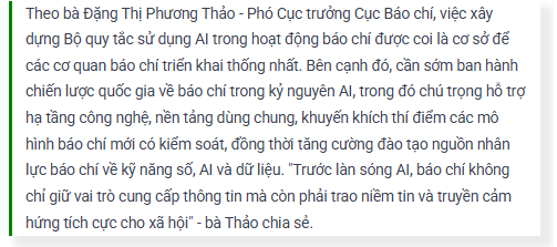 Phó Cục trưởng Cục Báo chí cũng cảnh báo những rủi ro lâu dài khi lệ thuộc vào AI, có thể làm suy giảm năng lực tác nghiệp độc lập và bản lĩnh nghề nghiệp của đội ngũ làm báo. Vì vậy, cơ quan quản lý nhà nước sẽ tiếp tục hoàn thiện thể chế, khung pháp lý về báo chí, bổ sung quy định liên quan đến sản xuất nội dung có sự tham gia của AI; xác định rõ trách nhiệm pháp lý của cơ quan báo chí và cá nhân nhà báo, không “đổ lỗi cho thuật toán”.