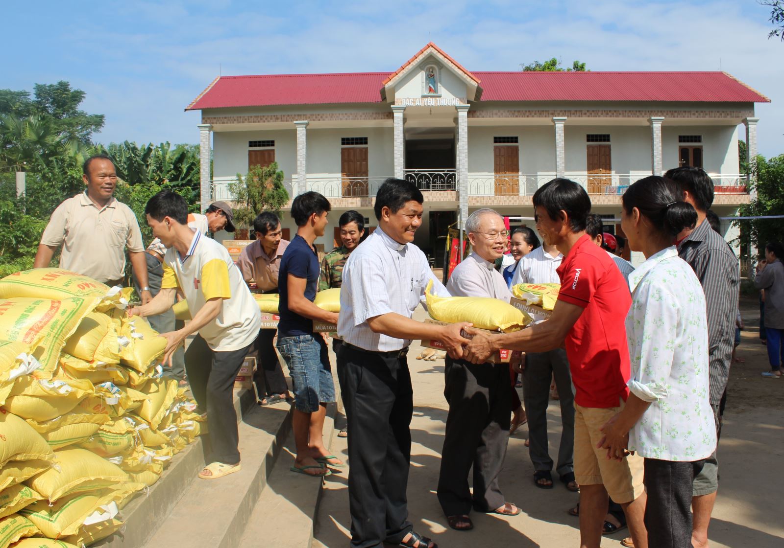 Ngay sau khi lũ vừa rút, hai linh mục dòng Đồng Công là cha Giuse Maria Vũ Kim Ngân - đặc trách Ban truyền giáo và cha Gioan Maria Nguyễn Thiên Khải - đặc trách Ban Bác ái Xã hội của nhà dòng đã đón chuyến bay sớm từ Sài Gòn về Quảng Bình cứu trợ. Tại giáo xứ Minh Cầm, hai cha ghé qua 5 giáo họ và 2 giáo điểm để trao tận tay bà con từng thùng mì, ký gạo. “Phần quà tuy đơn sơ nhưng với chúng tôi như vậy đã quá tốt và thấy thật ấm lòng”, bà Liên, giáo dân Minh Cầm nói. Tại các giáo phận cũng như các giáo xứ, các vị chủ chăn cũng kêu gọi giáo dân đóng góp, sẻ chia đến với đồng bào vùng lũ và ngay sau đó là những chuyến xe từ nhiều vùng miền như Nghệ An, Đà Nẵng… với biểu ngữ “Xe cứu trợ bà con lũ lụt” nối đuôi nhau chở hàng về tiếp tế.