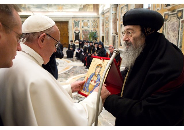 Lên tiếng trong buổi tiếp kiến, Đức Thánh Cha ghi nhận nhiều tín hữu thuộc các Giáo hội Chính thống Đông phương phải chịu nạn bạo lực và những hành vi kinh khủng có những kẻ cực đoan cuồng tín gây ra. Những tình trạng đau khổ bi thảm ấy càng dễ trở nên sâu đậm hơn trong những bối cảnh nghèo đói, bất công, bị gạt ra ngoài lề xã hội, và cũng do tình trạng bất an do những quyền lợi phe phái nhiều khi từ bên ngoài gây ra. Đức Thánh Cha ca ngợi hoạt động của các Giáo hội Chính thống Đông phương hằng ngày gần gũi với những người đau khổ và Ngài cũng khẳng định rằng: 'Nếu một chi thể đau khổ, thì toàn thể các chi thể khác cũng cùng đau khổ, như thánh Phaolô đã viết (1 Cr 12,26). Những đau khổ này của anh chị em cũng là đau khổ của chúng tôi. Đức Thánh Cha nói Ngài hiệp ý với mọi người trong kinh nguyện, cầu xin cho các cuộc xung đột chấm dứt và xin Chúa gần gũi những người đang chịu thử thách, nhất là các trẻ em, bệnh nhân và người già...