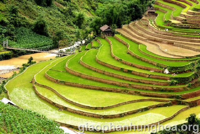 - Giáo phận Hưng Hóa trải dài ở cả ba địa thế : đồng bằng, trung du và thượng du. Núi đồi chiếm nhiều diện tích hơn đồng ruộng. Thượng du với dãy Hoàng Liên Sơn trùng điệp ở Lào Cai, Lai Châu, cho ta cảm giác mình đang gần với thiên đàng ! Tại Sapa, ta có thể trèo lên “nóc nhà Đông Dương” để nhìn xuống từ độ cao trên 3.000 mét. Đến với Hà Giang, ta như mê hồn với cao nguyên đá Đồng Văn, với Cổng Trời và Cột cờ Lũng Cú. Tại Mù Cang Chải, ruộng bậc thang thu hút không biết bao nhiêu du khách mỗi năm. Qua miền trung du, ta lại được nhìn thấy bao la bạt ngàn đồi chè và cây cọ, cây quế, cây keo lá tràm. Xuống miền đồng bằng Bắc bộ, hai giòng sông Hồng và sông Đà uốn khúc giữa những cánh đồng trồng ngô lúa đậu xanh rì. Địa thế khác biệt đã tạo cho giáo phận Hưng Hóa một vẻ đẹp nên thơ, quyến rũ.