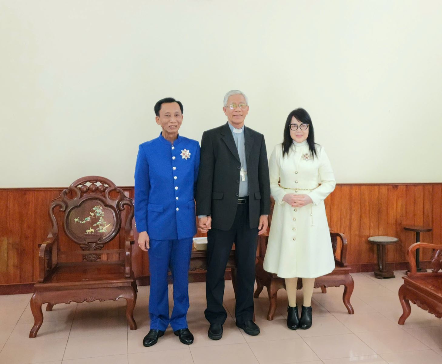 Phát biểu tại buổi tiếp, Chủ tịch Ủy ban Mặt trận Tổ quốc Việt Nam tỉnh Bình Định Nguyễn Thị Phong Vũ tin tưởng rằng, tình nghĩa đồng bào và tấm lòng bác ái của Hiệp sĩ Đại Thánh Giá và các thành viên trong đoàn công tác sẽ tiếp tục được lan tỏa, qua đó góp phần cùng Mặt trận Tổ quốc xây dựng khối đại đoàn kết toàn dân tộc và hỗ trợ người nghèo đón Tết sum vầy ấp áp. Đức cha Matthêô (đứng giữa) và Hiệp sĩ Đại Thánh Giá Lê Đức Thịnh cùng phu nhân- Hiệp sĩ Đại Thánh Giá Nguyễn Thị KIm Yến |