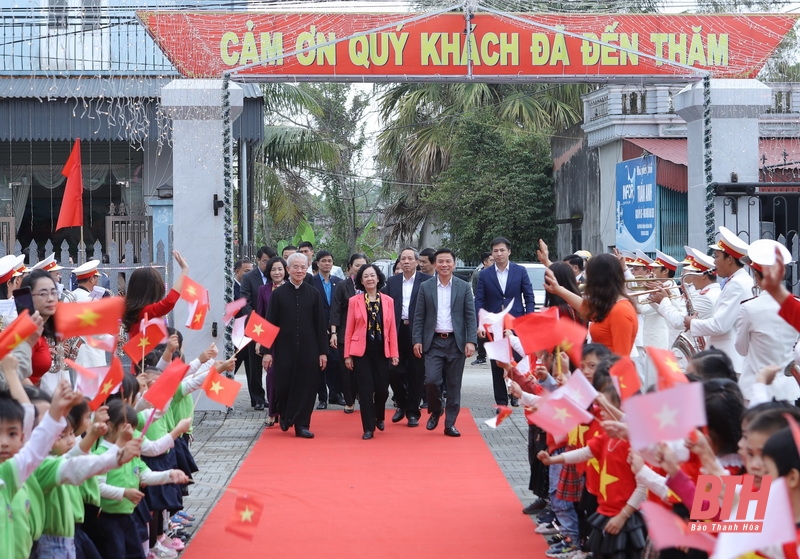 Trưởng Ban Tổ chức Trung ương Trương Thị Mai và Bí thư Tỉnh ủy Đỗ Trọng Hưng cùng các thành viên trong đoàn đến chúc tết giáo xứ Phúc Lãng, xã Quảng Trường (Quảng Xương).
