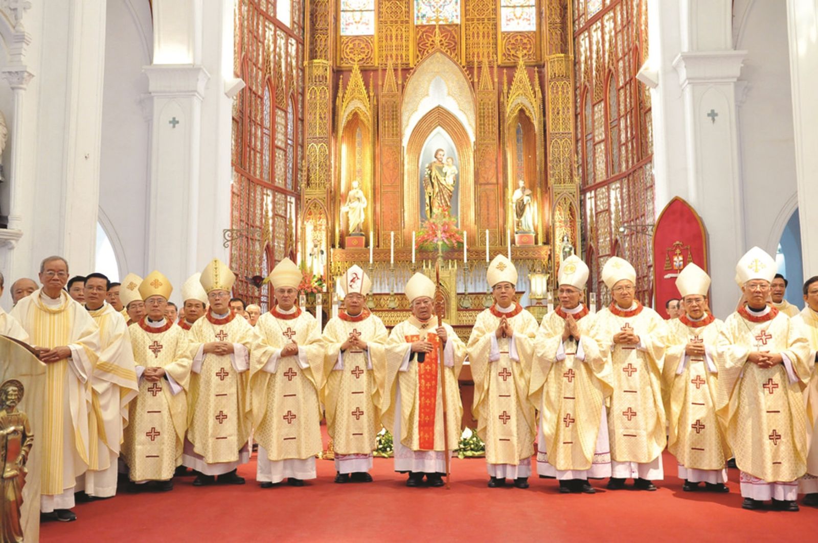 Đúng 10h, đoàn đồng tế được rước ra nhà thờ Chính tòa. Nếu so với những lễ kỷ niệm khác thì thánh lễ hôm nay thật đơn giản cả về hình thức và quy mô. Không có nhiều cờ quạt, khẩu hiệu và các đoàn hội kèn, trống. Hàng trăm linh mục và 9 Giám mục đã đồng tế với Ngài. Dự lễ đồng tế hôm nay còn có Đức Tổng Giám mục Leopold Girelli- Đại diện không thường trú của Tòa Thánh tại Việt Nam.