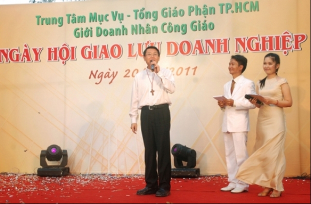 Đức cha phụ tá Phêrô Nguyễn Văn Khảm chia sẻ tâm tình với các anh chị em : Tôi bước vào khu vực tổ chức thấy một logo “Ngày hội giao lưu doanh nghiệp”, một logo khác “Các con hãy cho họ ăn” và nhiểu thùng quên góp cho các nạn nhân động đất và sóng thần tại Nhật Bản. tôi liên tưởng đến câu chuyện dụ ngôn trong Kinh Thánh “Người chủ chăn để 99 ở đó ,đi tìm con chiên lạc”. Đức Hồng Y của chúng ta có cách cắt nghĩa độc đáo về câu chuyện này,Ngài nói : Người chăn chiên rủ 99 con chiên cùng đi với mình đi tìm con chiên lạc để cho chắc ăn. Đó là ý tưởng chủ đạo trong các sinh hoạt mục vụ đa dạng, lôi kéo các giới và các đoàn thể vào hoạt động tông đồ của giáo phận, đồng thời hướng rộng ra hơn nữa tìm cách liên kết các anh chị em trong giới doanh nhân công giáo lại với nhau nên mới có Hội doanh nhân công giáo mà cụ thể là ngày hội giao lưu hôm nay. Giao lưu với nhau , nhờ giao lưu để thực thi lời mời của Chúa Giêsu “các con hãy cho họ ăn” mở ra những nhu cầu lớn lao hơn nữa để có thể chia sẻ không chỉ vật chất mà tinh thần với anh chị em đồng bào của mình và mọi người trên thế giới.