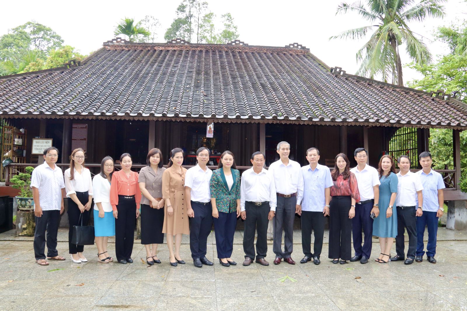 Phó Chủ tịch - Tổng Thư ký Nguyễn Thị Thu Hà cùng các thành viên trong đoàn chụp ảnh lưu niệm tại nhà lưu niệm thời niên thiếu của Chủ tịch Tôn Đức Thắng. |