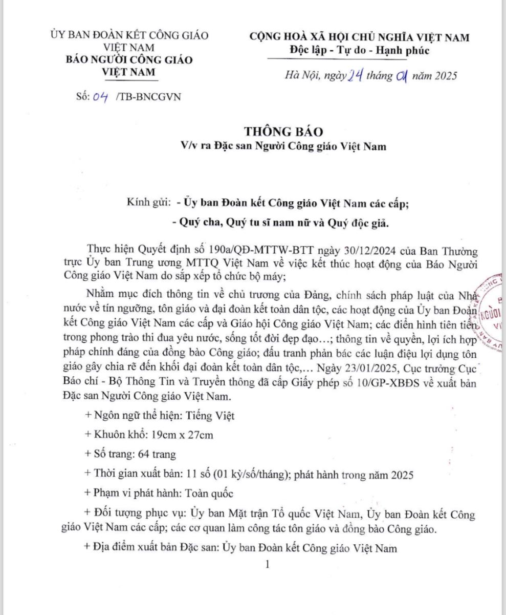 Nhằm cung cấp thông tin về chủ trương của Đảng, chính sách pháp luật của Nhà nước về tín ngưỡng, tôn giáo và đại đoàn kết toàn dân tộc, cũng như những hoạt động của Ủy ban Đoàn kết Công giáo Việt Nam, Giáo hội Công giáo và các điển hình tiên tiến trong phong trào thi đua yêu nước, Ban Biên tập Đặc san Người Công giáo Việt Nam xin trân trọng thông báo đến quý độc giả cả nước về việc phát hành số đầu tiên vào tháng 02/2025. Ban Biên tập rất mong nhận được sự quan tâm, ủng hộ và cộng tác từ Quý cha, Quý tu sĩ và Quý độc giả trong thời gian tới.