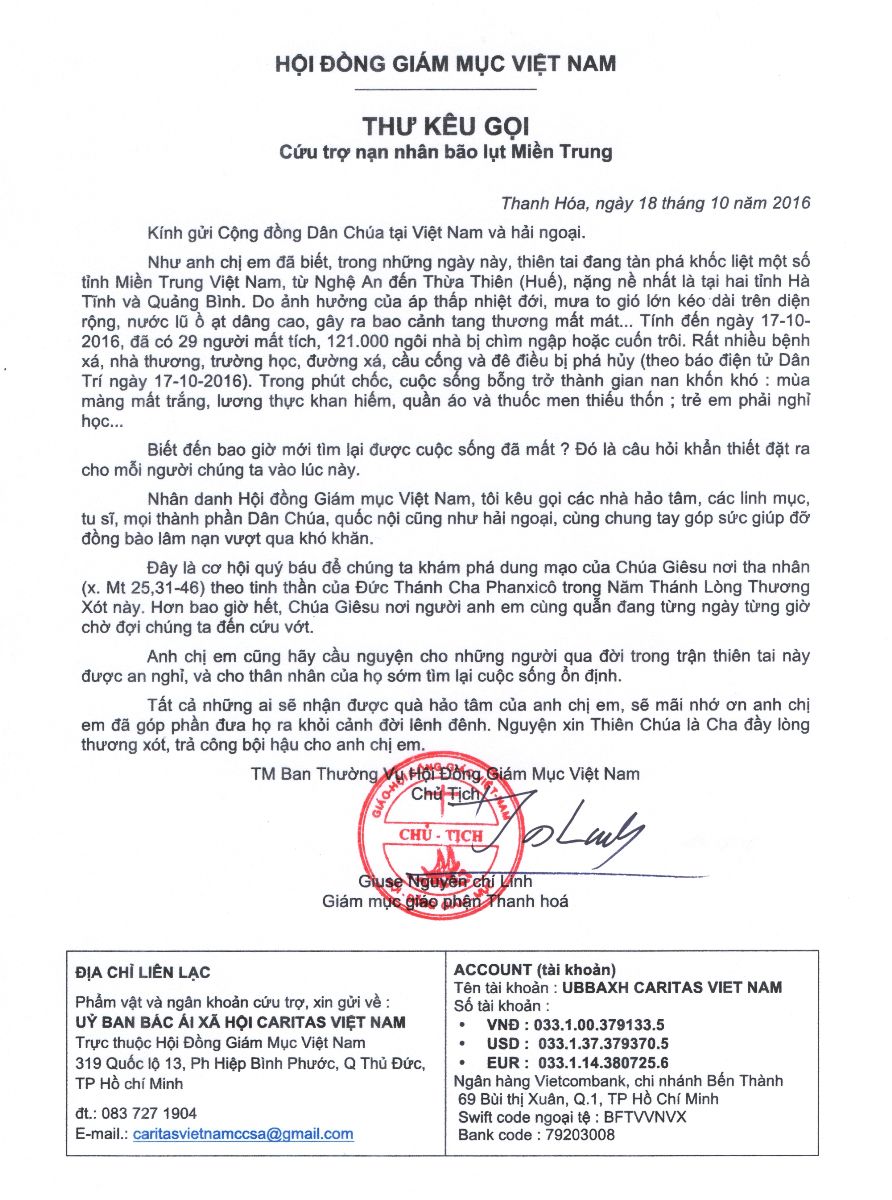 Hội đồng Giám mục Việt Nam: Thư kêu gọi cứu trợ nạn nhân bão lụt Miền Trung