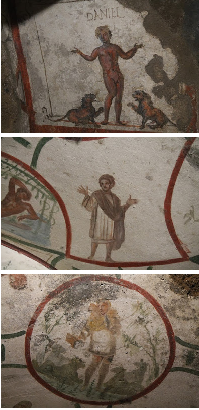 | “Đức Kitô ở giữa thánh Phêrô và thánh Phaolô”, tranh trong hầm mộ. Đây là một trong những tranh cổ nhất thế giới về Chúa Giêsu |