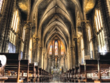 Chúng tôi đến thăm nhà thờ vào ngày thường nên nhà thờ chỉ mở cửa bên để đón du khách. Bước qua cửa bên vào trong nhà thờ thấy choáng ngợp vì một không gian rộng rãi, cao vút, không có cảm tưởng là đang ở trong nhà. Hai hàng cột đỡ, mái vòm, tường, tất thẩy đều bằng đá xám trắng. Những viên đá gọt đẽo công phu, kích thước đều nhau như hòn gạch. Trên cột, trên tường và mái vòm cũng như bên ngoài, không có họa tiết hoa lá cầu kỳ, thay vào đó là những hình khối chữ nhật nối tiếp nhau tạo cảm giác thanh thoát, nhẹ nhàng của công trình. Nên mặc dù nhà thờ có kích thước lớn, đồ sộ nhưng vẫn không thấy nặng nề của kết cấu bê tông và đá.