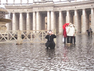 Quảng trường thánh Phêrô giờ đây đã hiện ra trước mắt chúng tôi, không phải là đứng nhìn xem nhưng là bước vào Quảng trường. Thật cảm động trước không gian rộng lớn và trang nghiêm. Trước mắt chúng tôi là những hàng cột cực lớn - những hàng cột mà nhìn trên ảnh chụp chỉ đơn giản là những cột chịu lực của dãy hành lang. Ở nơi đây những hàng cột vừa to lớn, uy nghiêm lại vừa phản ánh ngàn năm lịch sử. Có tất cả 284 cột như thế hình thành một vòng cung lớn tượng trưng hoàn cầu như đôi cánh tay của Mẹ Hội Thánh giang rộng ôm đón con cái khắp năm châu. Chúng tôi tiến vào, chụp ảnh và quay camera. Cột đá Aicập giữa quảng trường không phải tròn như chúng tôi tưởng tượng mà là vuông và vươn cao, trên chóp cũng là cây Thánh giá. Bên cạnh cây cột đá này là cây thông Noel cao 30m của miền Bắc nước Áo dâng đã được chuyển về đây trang trí Noel lộng lẫy. Bên dưới chân cột đá là hang Giáng sinh đang được lắp dựng dưới hình thức của ngôi nhà mà chúng tôi chỉ nhìn thấy mái. Hang này sẽ được mở ra vào lễ đêm Noel và chúng tôi được hạnh phúc tham dự lễ của Đức Thánh Cha. Một bên của đền Thánh Phêrô nổi lên hàng chữ lớn IN HONOREM PRINCIPIS-APOST PAVLVS-V-BVRGHESIVS-ROMANVS PONT MAY-AN-MDCXH-PONT-VN (Dâng kính thủ lãnh tông đồ - xây đời Đức Giáo hoàng Phaolô V). Trên cùng là tượng Chúa Giêsu đứng giữa, mười một thánh tông đồ đứng hai bên (thánh Phêrô dưới sân) hai góc có hai chiếc đồng hồ lớn. Bên dưới một chiếc đồng hồ là quả chuông nặng 9 tấn treo giữa 4 quả nhỏ khác ở 4 góc. Một nhà tạm có mái xuôi, dựng nên ở giữa chính điện, chiếc ghế bọc nệm đơn giản đặt giữa, nơi Đức Thánh Cha sẽ ngồi huấn dụ tuần này vào 10h30.
