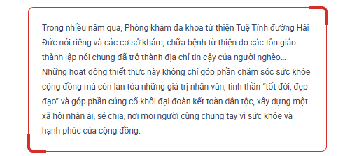 Trong hành trình xây dựng khối đại đoàn kết toàn dân tộc, những mô hình như Trung tâm từ thiện Thiên Ân hay Phòng khám đa khoa từ thiện Tuệ Tĩnh đường Hải Đức chính là những điểm tựa nhân văn, góp phần nuôi dưỡng niềm tin, lan tỏa yêu thương và làm đẹp thêm những giá trị tốt đẹp của xã hội. Chính từ những hành động giản dị nhưng vô cùng cao đẹp, niềm tin, sự đoàn kết và lòng nhân ái tiếp tục được vun đắp, tạo nền tảng vững chắc để xây dựng xã hội ngày càng tốt đẹp hơn.