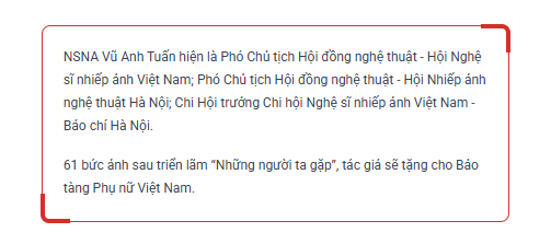 “Với tôi, thật may mắn khi nhiều ký ức lại được lưu giữ bằng những bức ảnh chụp, suốt mấy chục năm cầm máy ảnh đi đến nhiều tỉnh thành trong cả nước. Giờ đây, khi nhìn lại những bức ảnh đã chụp, ký ức được đánh thức ùa về, nhắc tôi về một sự kiện hoặc một phút giây đã trải qua” - NSNA Vũ Anh Tuấn chia sẻ.