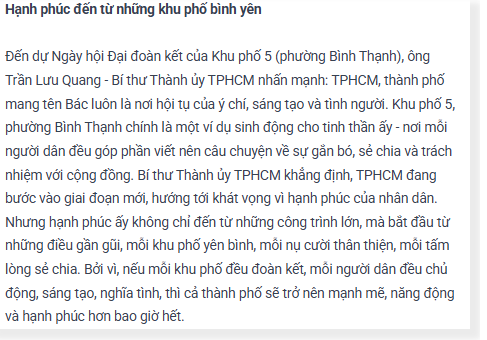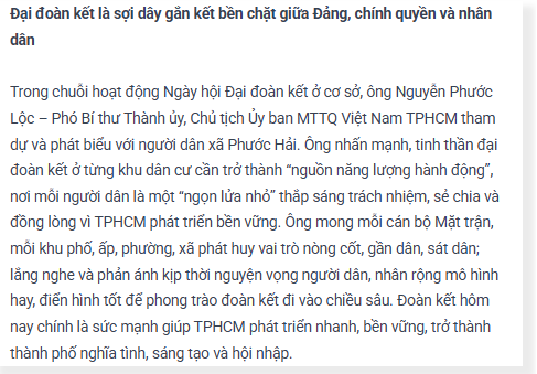 Không chỉ là ngày hội của nhân dân, nhiều lãnh đạo Thành ủy, UBND và MTTQ TPHCM đã có mặt tại những Ngày hội Đại đoàn kết ở cơ sở, để hòa cùng niềm vui chung, đồng thời lắng nghe, chia sẻ tâm tư của chính người dân.