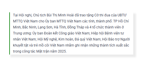 Nhân dịp sắp đón mừng năm mới Bính Ngọ 2026, thay mặt Ban Thường trực UBTƯ MTTQ Việt Nam, Chủ tịch Bùi Thị Minh Hoài trân trọng cảm ơn và kính chúc các đồng chí lãnh đạo, nguyên lãnh đạo Đảng, Nhà nước, các cụ, các vị, các đồng chí và toàn thể quý vị đại biểu dồi dào sức khỏe, hạnh phúc và thành công; tiếp tục đóng góp tâm sức, trí tuệ tham mưu cho Đảng, Nhà nước phát huy cao nhất sức mạnh đại đoàn kết toàn dân tộc, tạo đồng thuận xã hội, chung sức, đồng lòng thực hiện thắng lợi Nghị quyết Đại hội XIV của Đảng, góp phần xây dựng đất nước giàu mạnh, phồn vinh, văn minh, hạnh phúc.